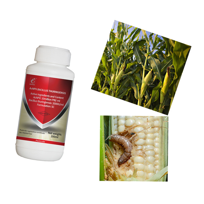Nadat insecten het pesticide hebben gevoerd, speelt Bacillus thuringiensis een eerste rol in de darmcellen van insecten, waardoor het immuunsysteem van het insect wordt verminderd, waardoor insecten gemakkelijker met het AcNPV kunnen worden geïnfecteerd.De AcNPV komt dan het lichaam binnen en draagt massale kopie en reproductie.De plagen verliezen hun vermogen om het gewas te beschadigen en uiteindelijk vervellen ze het lichaam en leiden tot de dood.Het AcNPV blijft de gezonde plagen en de volgende generatie infecteren door middel van lichaamsvloeistoffen en ontlasting van de dode insecten, net als een wormplaag, op deze manier, zal het ongedierte te beheersen in een lange tijd.