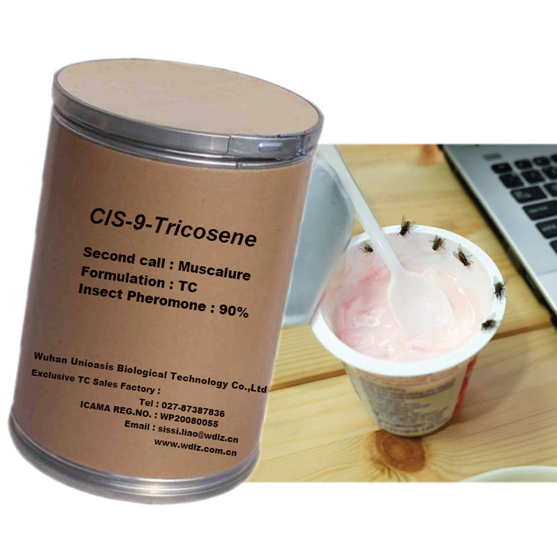 Z-9-Tricosene is een geslachtsferomoon dat wordt geproduceerd door vrouwelijke huisvliegen (Musca domestica) om mannetjes aan te trekken.Dit product is een insectenferomoon gesynthetiseerd door ons bedrijf met behulp van een chemische synthese methodeHet heeft een goed aantrekkelijk effect op kakkerlakken en vliegen. Het kan de insecticideffectiviteit van insecticiden verbeteren wanneer het in combinatie met insecticiden wordt gebruikt.Dit product wordt alleen gebruikt als aantrekkend middel in insecticiden.